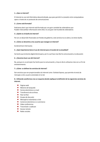 Internet es una red mundial de computadoras que permite el intercambio de información a través de un protocolo de comunicaciones descentralizado. Los usuarios que navegan en internet se denominan internautas y utilizan servicios como páginas web, correo electrónico, redes sociales y comercio electrónico. Las páginas web se alojan en servidores y se identifican por su dirección URL compuesta por protocolo, dominio y servidor.