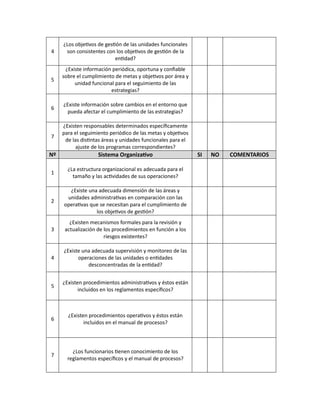 Este cuestionario evalúa siete áreas clave de control interno en una organización: integridad y valores éticos, administración estratégica, sistema organizativo, administración de personal, contabilidad, tecnología de la información y comunicaciones, y monitoreo. Consiste en preguntas sobre cada área para determinar si los controles internos existentes son adecuados y si se cumplen.