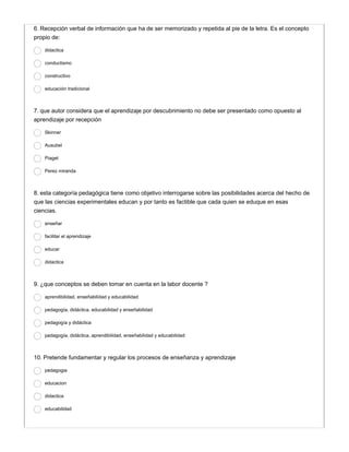 Este documento presenta 10 preguntas sobre conceptos pedagógicos clave como pedagogía, didáctica, educabilidad y enseñabilidad. La pedagogía se refiere a la capacidad de influencia del educador y al estudio de la educación como fenómeno social y humano. La didáctica estudia los procesos de aprendizaje y enseñanza y pretende fundamentar y regular estos procesos. Conceptos como aprendibilidad, enseñabilidad y educabilidad deben tomarse en cuenta en la labor docente.