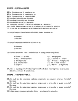Este documento contiene 65 preguntas sobre conceptos básicos de química orgánica como estructura molecular, hidrocarburos, grupos funcionales y reacciones químicas. Las preguntas cubren temas como números atómicos, enlaces, isómeros, alcanos, alcoholes, éteres, aldehídos, cetonas, ácidos carboxílicos y aminas. El cuestionario parece ser parte de una unidad de química orgánica para estudiantes de ingeniería industrial.