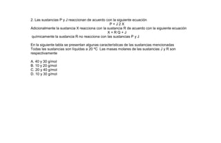 El documento contiene información sobre química, incluyendo propiedades de elementos en la tabla periódica, reacciones químicas, estructuras de compuestos, solubilidad y concentración de soluciones. Se proporcionan varias preguntas sobre estos temas para que el lector demuestre su comprensión.