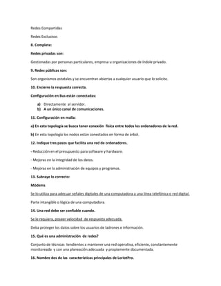 Este documento contiene 50 preguntas sobre conceptos básicos de redes de computadoras. Algunas de las preguntas se refieren a los objetivos de las comunicaciones, tipos de señales, características de las interfaces, clasificación del ruido, sincronización, tipos de redes, topologías de red, componentes de red como módems, routers, puertas de enlace, y tipos de cableado como par trenzado, coaxial y fibra óptica. Otras preguntas tratan sobre sistemas operativos, software, bases de