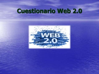 El documento presenta preguntas sobre conceptos clave de la Web 2.0 como wikis, blogs, redes sociales, YouTube y SlideShare. Explica que la Web 2.0 permite elaborar, modificar, almacenar e intercambiar información en línea de forma colaborativa. Define un blog como un sitio personal donde los usuarios publican artículos de forma cronológica y las redes sociales como portales para comunicarse y relacionarse a través de contenidos como fotos y videos creados por los usuarios. También describe a YouTube como un sitio para public