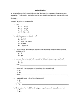 Este documento presenta dos cuestionarios. El primero busca conocer la importancia que representa la educación a través del arte en el desarrollo de los alumnos preescolares desde la perspectiva de docentes y padres de familia. El segundo cuestionario tiene el objetivo de conocer la importancia de la educación artística en la generación de un ambiente de aprendizaje desde la perspectiva de los docentes. Ambos cuestionarios incluyen preguntas sobre la formación recibida y percepciones sobre los beneficios de la educación artística.