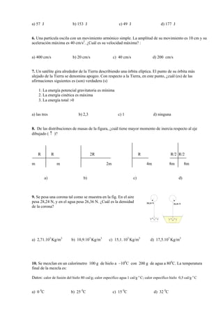 Este documento contiene 20 preguntas de opción múltiple para una prueba de física. Las preguntas cubren una variedad de temas como mecánica, termodinámica, electricidad, magnetismo y óptica. El documento incluye información como datos numéricos y figuras para ayudar a resolver cada pregunta.