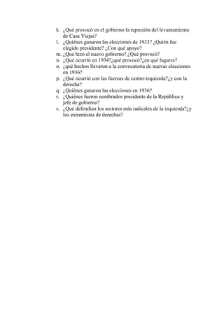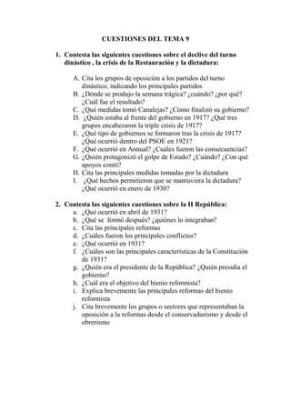 El documento contiene preguntas sobre el declive del turno dinástico en España, la crisis de la Restauración, la dictadura de Primo de Rivera y el periodo de la Segunda República. Algunas de las preguntas se refieren a los grupos de oposición al turno dinástico, la semana trágica de Barcelona en 1909, las medidas de Canalejas antes de su asesinato, los tres grupos que encabezaron la triple crisis de 1917, los tipos de gobiernos formados tras la crisis de 1917 y lo ocurrido dentro del P