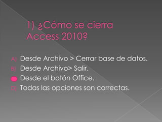 Este documento contiene una serie de preguntas y respuestas sobre el uso de Microsoft Access. Cubre temas como cómo cerrar una base de datos, cómo ocultar y mostrar la cinta de opciones, si es posible acceder a todas las funciones sin usar el ratón, y cómo acceder a la ayuda del programa.
