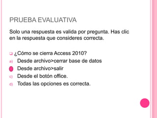 Este cuestionario evalúa el conocimiento sobre las funciones básicas de Access 2010. Contiene preguntas sobre cómo cerrar Access 2010, las barras y opciones disponibles en la interfaz como la cinta de opciones, barra de título, pestañas y grupos, y dónde encontrar opciones comunes como Abrir, Cerrar o Guardar una base de datos.