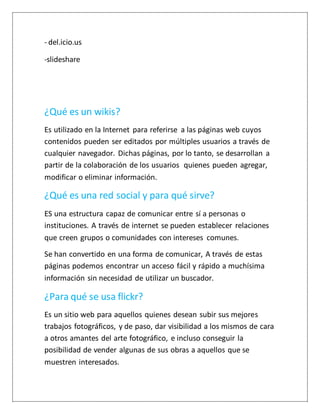 La web 1.0 permitía a los usuarios principalmente consumir contenido creado por otros, mientras que la web 2.0 permite a los usuarios crear y compartir contenido a través de herramientas como wikis, redes sociales, Flickr, YouTube y SlideShare. Estas herramientas incluyen wikis que permiten la edición colaborativa de páginas web, redes sociales que facilitan la comunicación y el intercambio de información entre usuarios, y sitios como Flickr, YouTube y SlideShare que permiten subir y compartir fotos, videos y