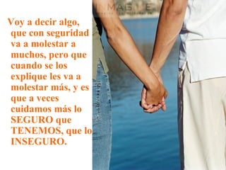 El documento enfatiza la importancia de cuidar a la pareja por sobre la familia debido a que la pareja requiere de un cuidado diario para mantenerse, a diferencia de la familia que es segura. Se debe dar todo en una pareja para formar un vínculo, ya que a diferencia de la familia no hay lazos de sangre. El amor de pareja es como cuidar un hijo discapacitado que depende completamente de uno.