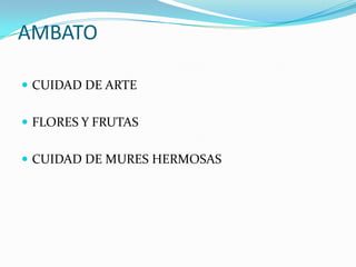 El documento describe la ciudad de Ambato en Ecuador. Ambato es conocida por sus frutas, flores y mujeres hermosas. En 1949, un terremoto destruyó gran parte de la ciudad y cobró la vida de 6,000 personas. Tres días después, en las ruinas, se realizó una feria con flores y frutas. En 1951 se celebró el primer festival de la fruta y las flores, donde Maruja Cobo, de 17 años, fue coronada reina.