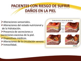 Este documento proporciona instrucciones para mantener la piel intacta de los pacientes. Se recomienda realizar aseo general cada 24 horas y parcial cuando sea necesario utilizando jabones suaves. Además, se debe examinar la piel diariamente, realizar cambios posturales cada 2-3 horas, aplicar emulsión cutánea y proteger las prominencias óseas con apósitos para prevenir lesiones.