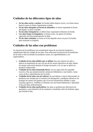 El documento proporciona recomendaciones para el cuidado de diferentes tipos de uñas, incluyendo uñas cortas y anchas, alargadas en forma de almendra, triangulares, largas rectangulares y redondas. También describe problemas comunes de las uñas como las débiles, demasiado duras, con nervaduras y quebradizas, y recomienda tratamientos como aplicar productos hidratantes, endurecedores y regeneradores para fortalecer y suavizar las uñas.