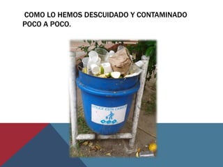 El documento habla sobre la contaminación y el descuido del medio ambiente como el agua y la flora a lo largo del tiempo y hace un llamado a tomar conciencia sobre el cuidado del planeta apreciando su belleza y dejando de contaminarlo empezando desde el hogar para asegurar un ambiente más saludable y sostenible.