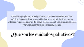 Este documento describe los cuidados paliativos, que buscan mejorar la calidad de vida de pacientes con enfermedades terminales o crónicas incurables a través del control del dolor y otros síntomas, así como el apoyo médico, psicológico y familiar. Los cuidados paliativos se enfocan en pacientes de cualquier edad con cáncer u otras enfermedades avanzadas, con el objetivo de aliviar el sufrimiento a través de un enfoque multidisciplinario e integral. Existen guías clínicas en Colombia para la atención