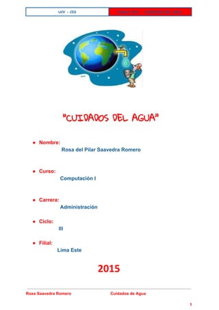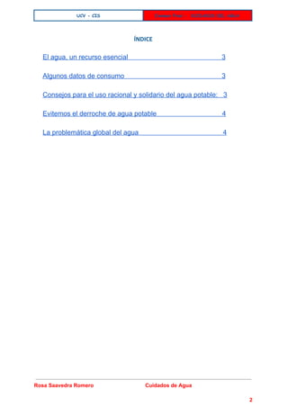 El documento trata sobre los cuidados del agua. Explica que el agua es un recurso esencial pero limitado, por lo que es importante usarla de manera racional y solidaria. Proporciona datos sobre el consumo de agua promedio y consejos para reducir el derroche, como regar con balde en lugar de manguera. También discute la problemática global del agua, señalando que debido a la escasez de lluvias y el aumento de la población, muchos países como México enfrentan problemas de disponibilidad y contaminación del agua