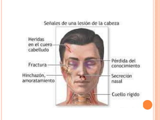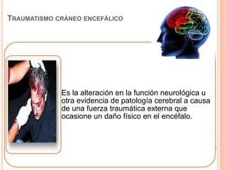 El documento proporciona información sobre el cuidado de enfermería en pacientes con traumatismo craneal. Describe los signos y síntomas del traumatismo craneal, las causas, la clasificación y las lesiones primarias y secundarias. También detalla los exámenes requeridos, los cuidados de enfermería como la nutrición, la vigilancia de signos vitales y la prevención de úlceras por presión. El objetivo es brindar atención especializada a estos pacientes para prevenir complicaciones y mejorar los resultados