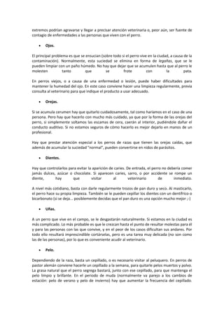 El documento proporciona información sobre los cuidados básicos de un perro, incluyendo visitas regulares al veterinario, ejercicio diario, espacio para dormir, limpieza regular, eliminación de parásitos y precauciones durante los paseos como evitar que coma basura u orines de otros perros.