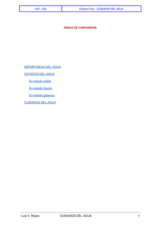 El documento describe la importancia del agua para la vida y los tres estados en que se encuentra el agua (sólido, líquido y gaseoso). Luego, proporciona una lista de cuidados del agua, como cerrar las llaves mientras se enjabona, usar regadera en lugar de tina, reparar tuberías que gotean, lavar la vajilla en grupos para aprovechar mejor el agua, usar cubetas para lavar en lugar de manguera, instalar inodoros de doble carga y aprovechar el agua de lluvia