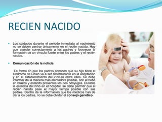 El documento describe los cuidados para recién nacidos con síndrome de Down y sus padres. Recomienda comunicar la noticia del diagnóstico de una manera alentadora con el bebé y los padres presentes, y permitir que el bebé pase tiempo con sus padres en el hospital. También enfatiza la importancia de la estimulación temprana en el primer año para maximizar el desarrollo del niño.
