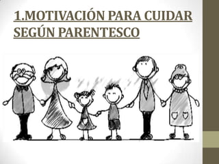 Este documento describe los principales motivos y factores que influyen en el cuidado informal de ancianos. Generalmente, son las mujeres de la familia como hijas, esposas o nueras quienes asumen este rol debido a la cultura. El cuidado informal se caracteriza por ser responsabilidad de la familia sin remuneración, a diferencia del cuidado formal. Los factores de carga incluyen modificaciones laborales y falta de tiempo libre. Sin embargo, la rotación del cuidado entre familiares y la resiliencia del cuidador pueden mitigar esta carga.