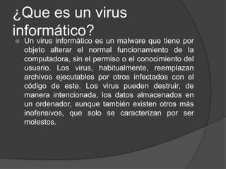 El documento explica qué son los virus informáticos, cómo funcionan y afectan a los computadores. Los virus son programas maliciosos que se replican a sí mismos y se propagan a través de otros programas, infectándolos sin el permiso del usuario. Pueden causar daños como la pérdida de datos o la reducción del rendimiento del sistema. Existen diferentes tipos de virus como troyanos, gusanos y bombas lógicas.