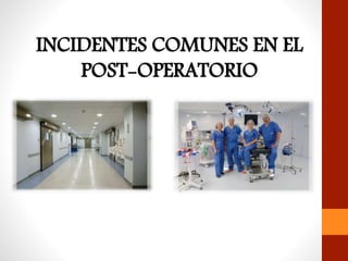 Este documento proporciona información sobre el proceso de recuperación post-anestésica, incluyendo las fases de recuperación, el traslado del paciente de la sala de cirugía a la unidad de cuidados post-anestésicos, la monitorización requerida y las posibles complicaciones. Además, describe los criterios para dar de alta a los pacientes basados en la escala de Aldrete.