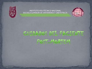 Este documento trata sobre los cuidados del paciente post-mortem. Explica los tipos de muerte, incluyendo la muerte biológica, clínica y natural. También describe las creencias culturales y religiosas sobre la muerte en México y el mundo, como el catolicismo, budismo e hinduismo. Finalmente, detalla los signos de muerte inminente y el procedimiento para amortajar un cuerpo, incluyendo lavarse las manos, colocar el sudario y limpiar la habitación después.