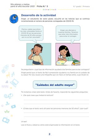 El documento presenta una ficha de trabajo para estudiantes de sexto grado sobre el análisis e interpretación de una infografía relacionada con el cuidado de la salud en familia durante la pandemia de COVID-19. La ficha incluye preguntas orientadoras, la lectura de la infografía titulada "Cuidados del adulto mayor", y preguntas posteriores a la lectura para evaluar la comprensión del mensaje y contenido de la infografía.