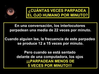 Este documento proporciona consejos de un oftalmólogo sobre el cuidado de la vista y la prevención de fatiga ocular al usar pantallas. Recomienda parpadear con más frecuencia, ubicar el monitor debajo de la línea de visión, tomar descansos regulares, y usar lubricantes oculares. También advierte sobre posibles problemas de salud como dolores de cabeza y espalda si no se toman medidas ergonómicas adecuadas al trabajar frente a una pantalla.