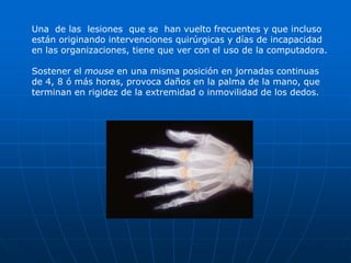 La lesiones relacionadas al uso prolongado del mouse están aumentando y causando días de incapacidad laboral, ya que sostener el mouse en la misma posición por varias horas seguidas puede dañar la palma de la mano y causar rigidez o inmovilidad en los dedos. El documento recomienda variar la posición del mouse durante el día para cuidar la salud de la mano y prevenir estas lesiones.