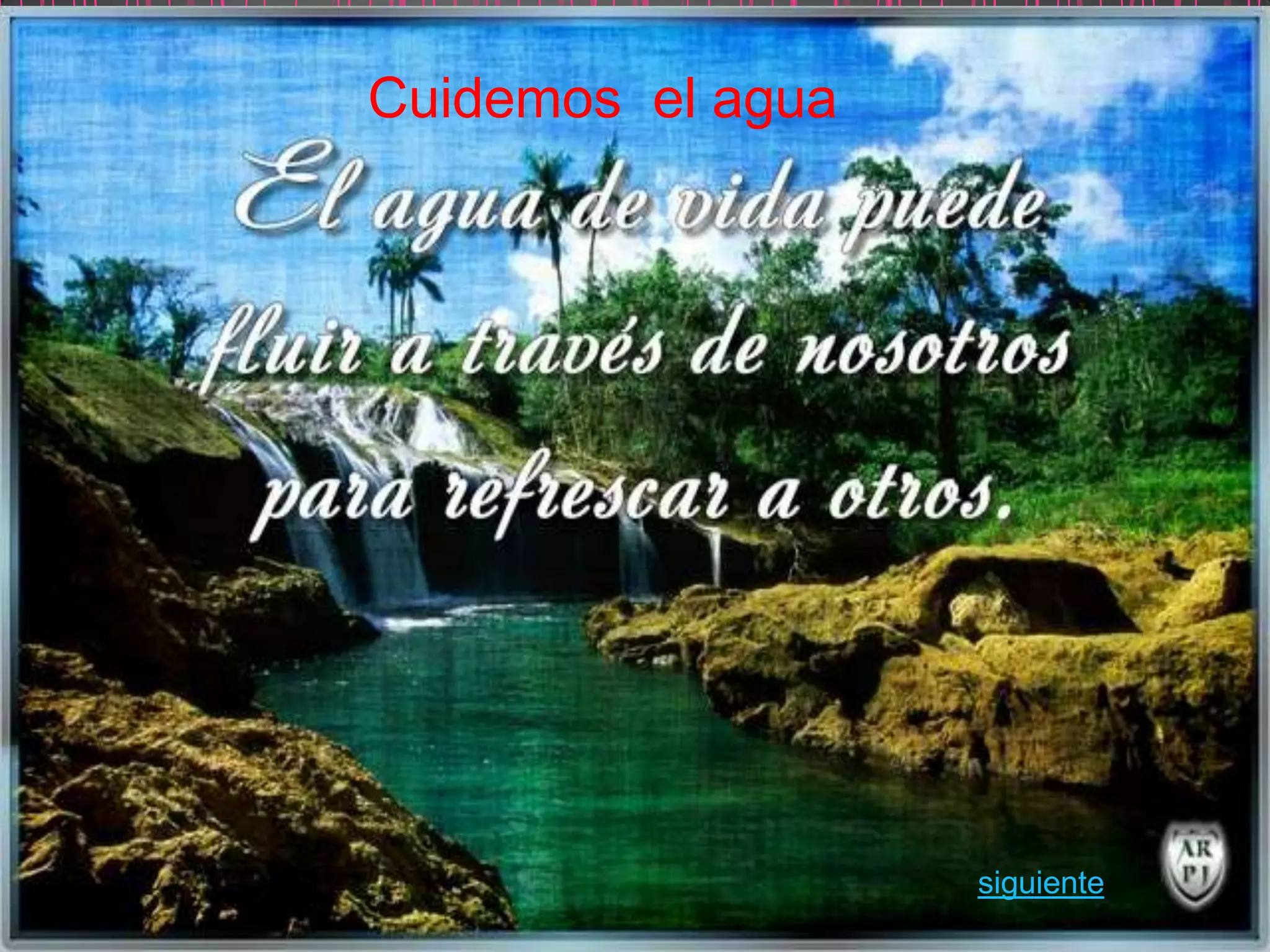 El documento habla sobre la importancia de cuidar el agua. El agua es esencial para la vida pero sólo representa una pequeña parte del planeta. Debemos proteger el agua dulce que tenemos para satisfacer las necesidades humanas y de los millones de especies que comparten el planeta.