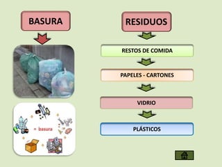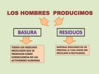 El documento habla sobre los residuos y basura que se producen como consecuencia de las actividades humanas. Describe los diferentes tipos de desechos como restos de comida, papeles, vidrio, plásticos, y cómo algunos materiales como el petróleo son usados para producir combustibles, plásticos, y fibras sintéticas que se utilizan en una variedad de productos.