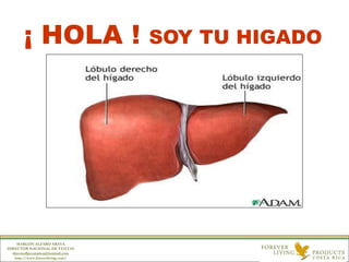 El documento es un mensaje del hígado personificado, enfatizando su importancia en la salud y función del cuerpo. Se alerta sobre los daños que provocan el alcohol, las drogas y las comidas poco saludables, y se aconseja cuidar el hígado a través de una dieta balanceada y evitando productos químicos. Finalmente, se subraya que la salud del hígado es crucial para el bienestar general y que él no dará advertencias hasta que sea demasiado tarde.