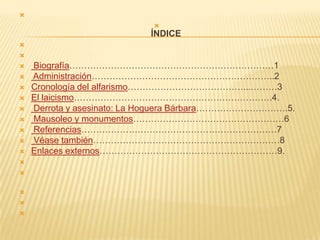 Eloy Alfaro fue un líder político ecuatoriano que se desempeñó como Presidente del Ecuador en dos ocasiones entre 1897-1901 y 1906-1911. Luchó contra el conservadurismo católico durante décadas y promovió reformas laicas como la separación entre la iglesia y el estado. Después de dejar la presidencia, fue desterrado y asesinado por una turba en 1912, marcando el fin de la Revolución Liberal que había liderado.