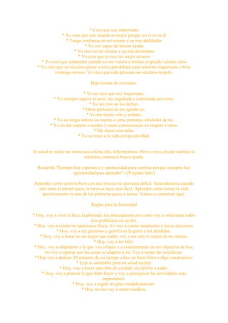 El documento explora el concepto del sentido de la vida y cómo este puede ser provisional u no provisional. Un sentido de vida no provisional es aquel que puede guiarnos independientemente de nuestra situación, como "amar la realidad que construyes", "superar el dolor y el sufrimiento", o "humanizar el mundo". El documento también discute la importancia de tener una alta estima de uno mismo, y propone reglas y conductas para mejorar la autoestima y alcanzar metas a corto y largo plazo.