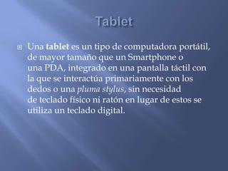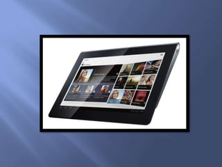 Este documento describe y compara las características de varias tablets populares. Incluye detalles sobre las pantallas, procesadores, capacidades de almacenamiento y memoria, cámaras, sistemas operativos y baterías de tabletas como la Apple iPad, Samsung Galaxy Tab 10.1, Asus Eee Pad Transformer, Sony Tablet y Barnes & Noble Nook.