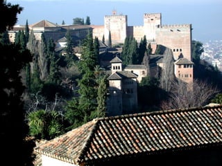 El documento describe brevemente lugares y aspectos culturales de Granada, España, incluyendo la Alhambra, el Patio de los Leones y Arrayanes, las cuevas y el barrio del Sacromonte, conocido por su música y danza nocturnas.