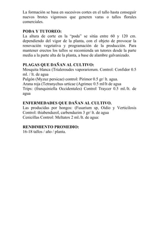 Este documento proporciona instrucciones para el cultivo de rosas, incluyendo la preparación del suelo, abonado, siembra, nutrición, poda, plagas y enfermedades. Se recomienda una labor profunda del suelo, incorporar estiércol y turba, y aplicar fertilizantes minerales. La siembra se realiza en líneas separadas 35-40 cm con plantas cada 15 cm para una densidad de 7 plantas/m2. La nutrición se proporciona mediante fertilizantes nitrogenados, fosfatados y potásicos