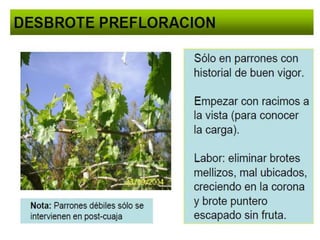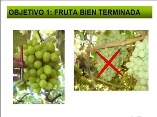 El documento describe el cultivo de uva de mesa, incluyendo su origen en Europa y Asia Menor, taxonomía, morfología, requerimientos de clima y suelo, patrones comunes como Salt Creek y Harmoni, variedades populares como Crimson Seedless y Red Globe, y sistemas de conducción como el doble T. También discute análisis de yemas, poda, factores que afectan la productividad, y plagas comunes como la filoxera.