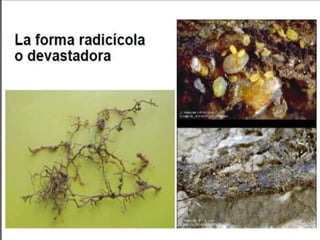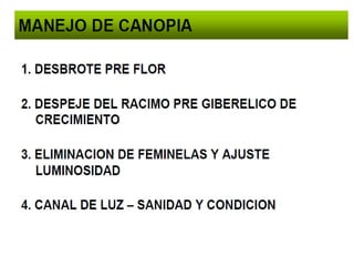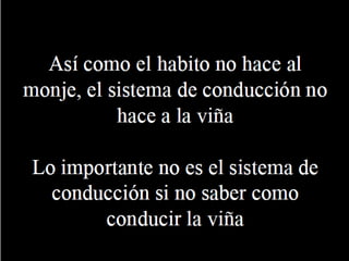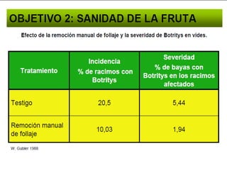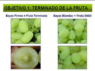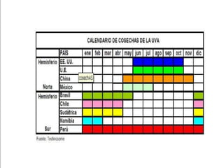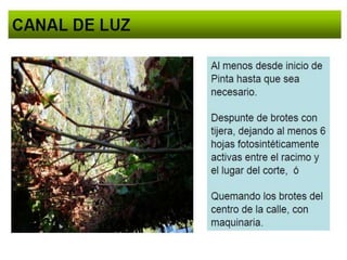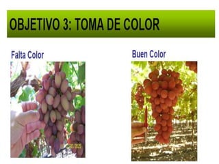 Este documento describe el cultivo de la uva de mesa. Detalla el origen, taxonomía, morfología, clima y suelos ideales, patrones comunes, y variedades populares como Crimson Seedless, Red Globe, Flame Seedless y Thompson Seedless. También cubre temas como sistemas de conducción, análisis de yemas, poda, aplicación de reguladores de crecimiento, y plagas y enfermedades comunes como oidio y filoxera.