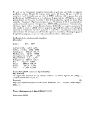 Los cultivos andinos en la sierra peruana han aumentado su área y producción, aunque con rendimientos promedio de cebada y trigo aún bajos. A pesar de los bajos rendimientos, hay un creciente interés por rescatar cultivos tradicionales y una ligera alza en la demanda de cultivos nativos. La exportación de productos como maíz blanco y quinua muestra potencial, pero se requiere mayor apoyo a la agricultura para lograr la seguridad alimentaria nacional.