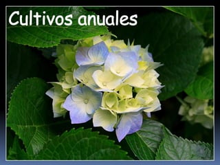 Los cultivos anuales son aquellos que completan su ciclo de vida en un año o menos. El maíz es un cultivo anual importante que requiere temperaturas entre 10°C y 40°C para germinar, crecer y florecer, así como suelos profundos y bien drenados con pH entre 6 y 7 para una buena producción. El maíz es el segundo cultivo más cultivado en el mundo después del trigo y es muy importante para la alimentación animal y humana a nivel global.