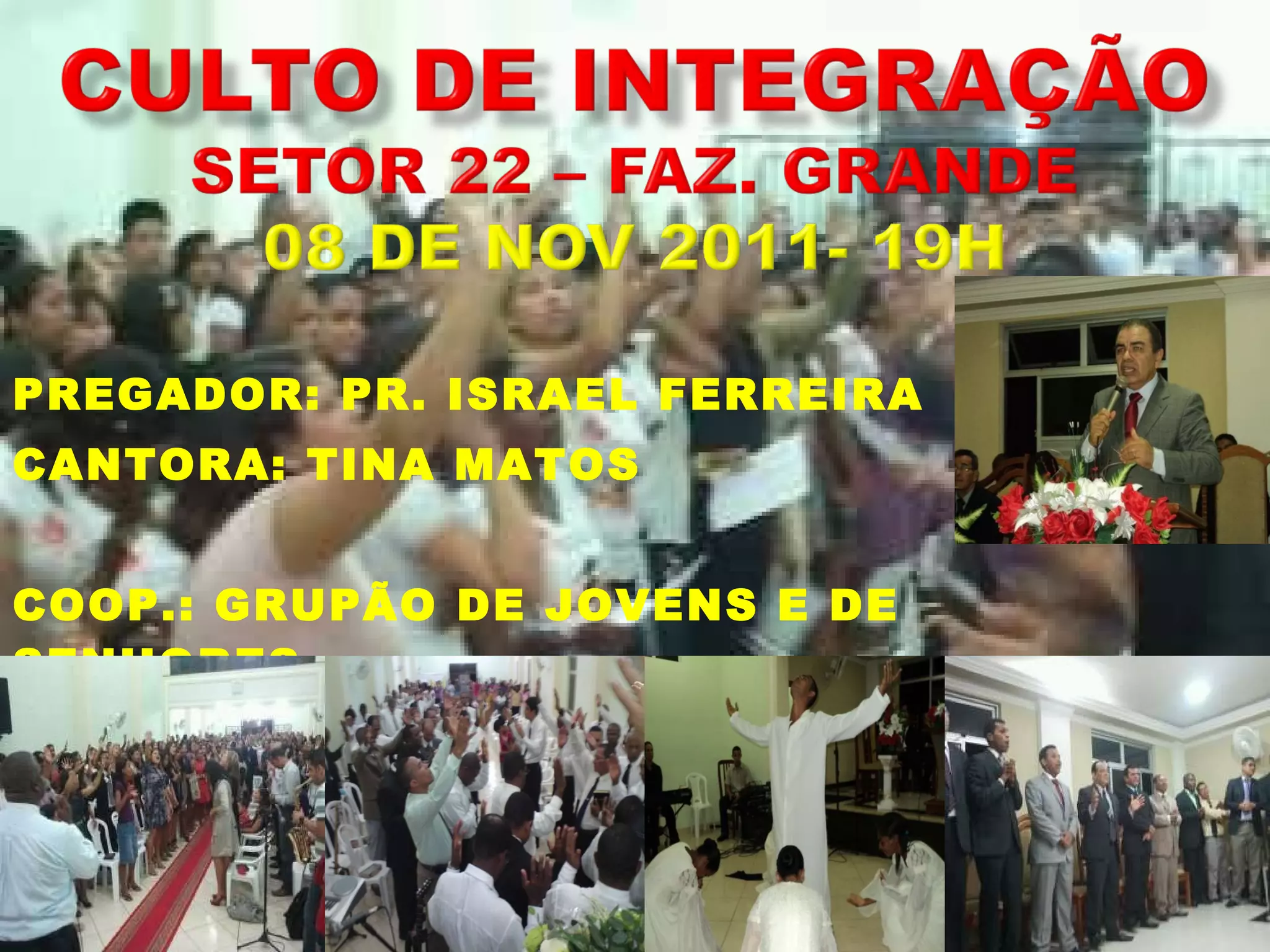 El documento lista el predicador, cantora y cooperación para un servicio religioso. El predicador es el Pr. Israel Ferreira, la cantora es Tina Matos y la cooperación es del Grupão de Jovens e de Senhores.