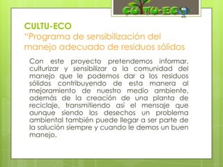 El documento presenta un proyecto llamado CULTU-ECO que tiene como objetivo sensibilizar a la comunidad sobre el manejo adecuado de residuos sólidos y crear una planta de reciclaje. El proyecto busca informar, educar y crear conciencia sobre la importancia de darle un buen manejo a los desechos para mejorar el medio ambiente. La misión es darle un manejo integral a los residuos desde su origen a través de actividades de sensibilización y la creación de una planta de reciclaje.