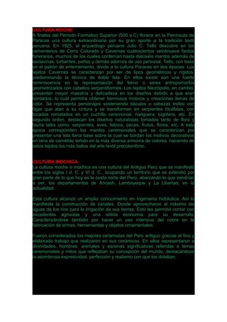 La cultura Moche se desarrolló entre los siglos I d.C. y VI d.C. en la costa norte del Perú, destacando por su ingeniería hidráulica para la irrigación y por su cerámica finamente elaborada, representando deidades, personas y animales. La cultura Chimú, entre 1100 y 1400 d.C., produjo textiles influenciados por diseños arquitectónicos, mostrando escenas humanas. La cultura Nazca se desarrolló en el valle de Nazca entre 300 a.C. y 600 d.C.,
