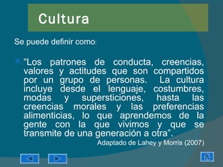 El documento define la cultura como los patrones de conducta, creencias, valores y actitudes compartidos por un grupo de personas que se aprenden y transmiten entre generaciones. Describe los elementos clave de la cultura como creencias, valores, normas, tradiciones, leyes y símbolos. También explica que existen variaciones culturales como subculturas y contraculturas.