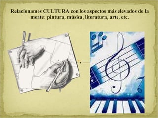 El documento presenta una introducción a varios conceptos clave relacionados con la cultura, incluyendo la definición de cultura, la relación entre cultura y sociedad, la diversidad cultural, las subculturas y el relativismo cultural. También explora cómo la cultura influye en la adaptación humana desde perspectivas biológicas y sociales.