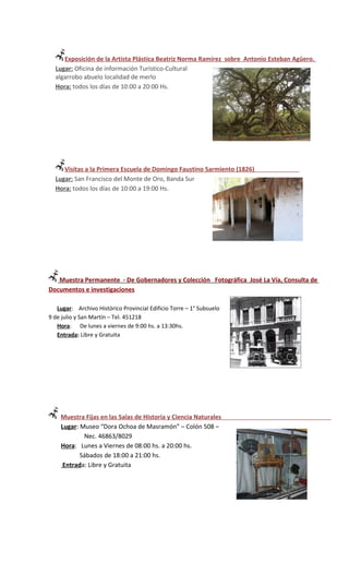 El documento anuncia varios eventos culturales que tendrán lugar en enero de 2010 en San Luis para celebrar el Bicentenario de la Revolución de Mayo, incluyendo exhibiciones de arte, espectáculos musicales, visitas guiadas a museos y sitios históricos, y más.