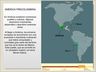 Los Aztecas fundaron su capital Tenochtitlán en el centro de México y crearon un gran imperio que se expandió por gran parte del país entre los años 1200 y 1520 d.C. Construyeron impresionantes ciudades como Tenochtitlán y Tlatelolco sobre el lago Texcoco, desarrollando una agricultura avanzada y un activo comercio. Su sociedad estaba jerarquizada y rendían culto a dioses como Huitzilopochtli a través de sacrificios humanos como parte de su cosmología.